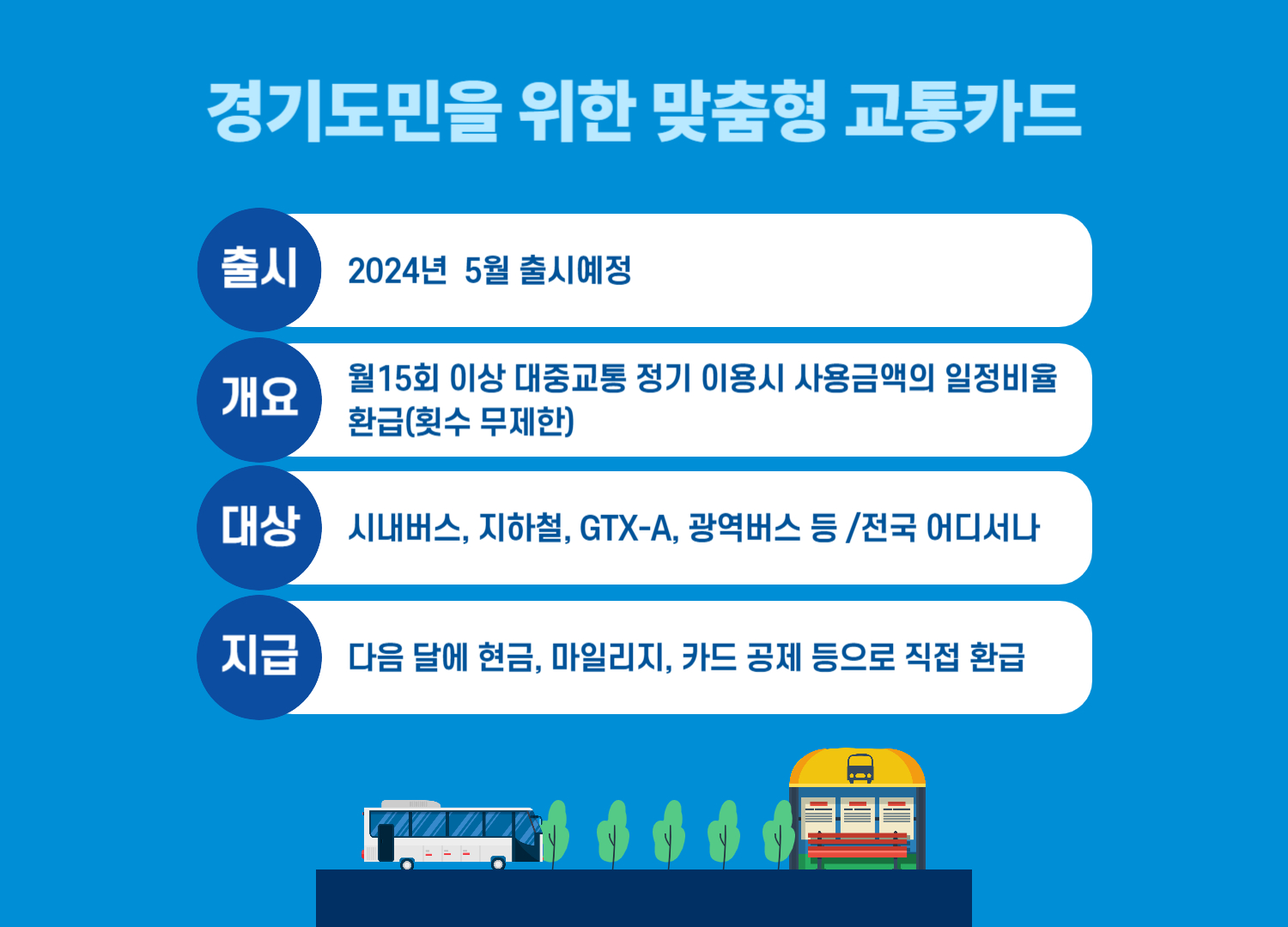 - 기존 교통카드처럼 자유롭게 이용하면 자동으로 환급